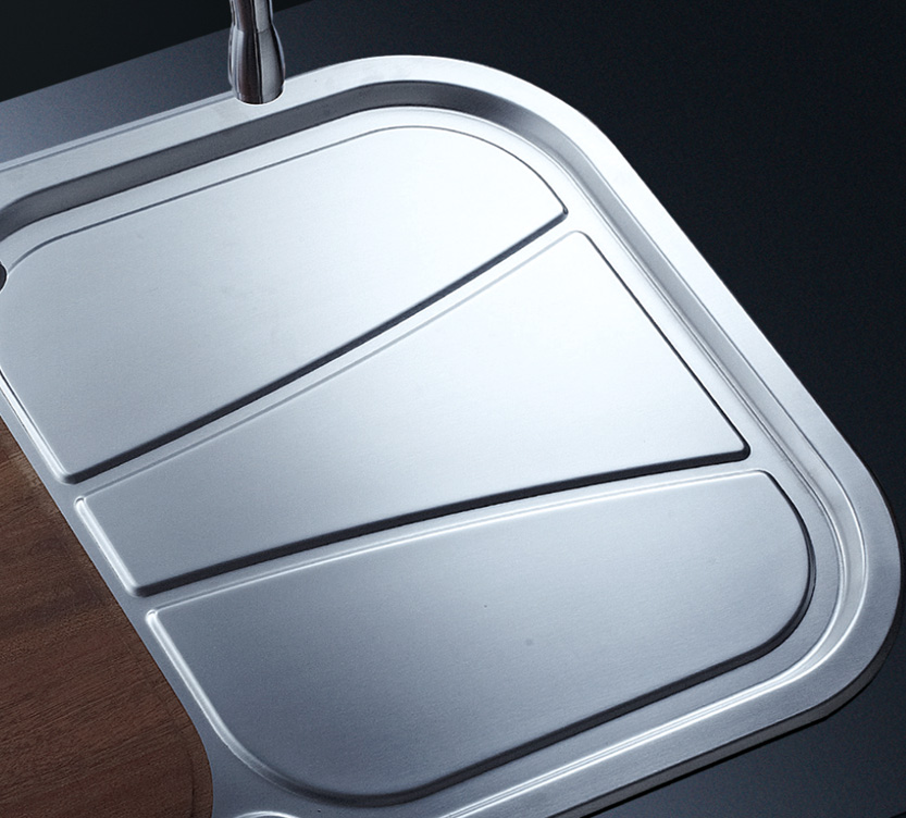 槽底采用斜面壓痕,四輻導流槽設計,與平面壓痕和無痕水槽相比,導水更為流暢,下水更迅速,能有效防止積水,消除沉淀物