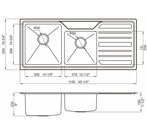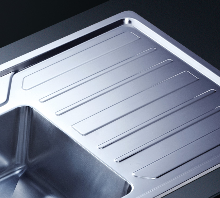 槽底采用斜面壓痕,四輻導流槽設計,與平面壓痕和無痕水槽相比,導水更為流暢,下水更迅速,能有效防止積水,消除沉淀物