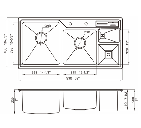 槽底采用斜面壓痕,四輻導流槽設計,與平面壓痕和無痕水槽相比,導水更為流暢,下水更迅速,能有效防止積水,消除沉淀物